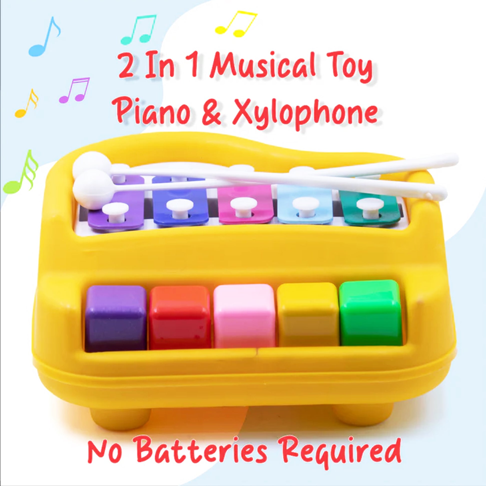 ToyBharat musical Xylophone & piano is a multicolour musical and educational toy for kids aged 1-6. It promotes music learning, motor skills, and safe indoor-outdoor play with vibrant design and joyful sound.
